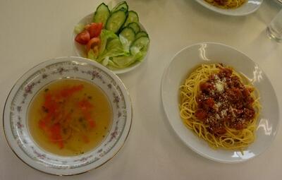 今回は「ミートスパゲッティ、コンソメスープ、グリーンサラダ」を作りました。