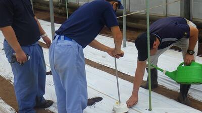 長雨で周りの圃場は水浸しになっていますが、野菜温室では重要な学習の一つであるメロン栽培の定植準備を行いました。