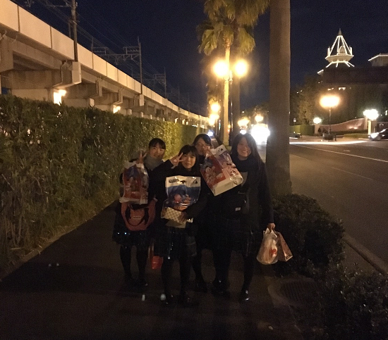 修学旅行2日目⑥ 投稿日時 : 2017/12/17 学校サイト管理者 自主研修を終え、生徒たちは大きな袋を下げ続々とホテルへ帰ってきました。どんな一日を過ごしたのでしょうか。 明るい笑顔を見ると安心しますね。生徒たちは全員無事にホテルへ帰りました。 お帰りなさい。明日は修学旅行3日目、夢の国へ行ってきます。