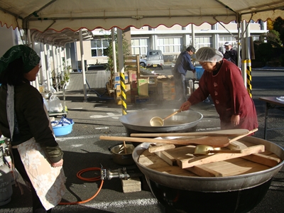 大鍋でおいしい豚汁とぜんざいを作って生徒のゴールを待っていてくださいます。