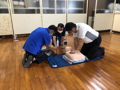 コロナウイルス感染症を考慮して声かけや呼吸の確認、胸部圧迫とAEDの使用法を研修しました。