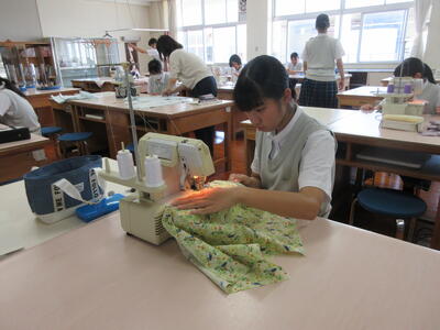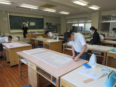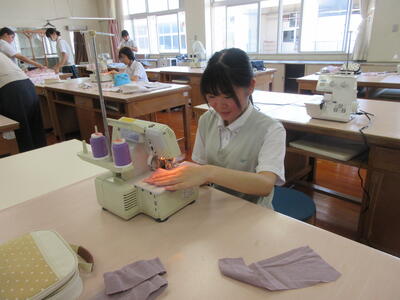 家政科1年の「ファッション造形基礎」では、家庭科技術検定3級の内容「アウターパンツ」製作に取り組んでいます。