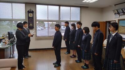 12月19日(金)に校内農業クラブ役員認証式が行われました。農業クラブとは高校で農業を学ぶ生徒の組織であり、農業関係の行事の企画・運営を行っています。10名の生徒が新役員となりこれから1年間、北稜高校の農業関係の各行事を運営していきます。