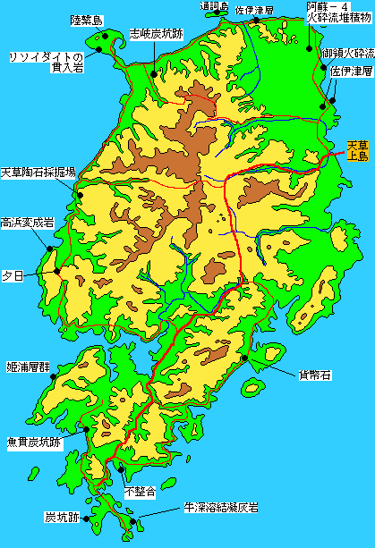 天草下島は,島の中央部を低地帯が北北東-南南西に貫いている。