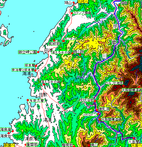 「○○太郎」・・・「太郎」とは峠を意味する古い言葉で古来陸の難所であった。国道3号線では水俣までに赤松太郎・佐敷太郎・津奈木太郎の3つの大きなトンネルをくぐることになる。