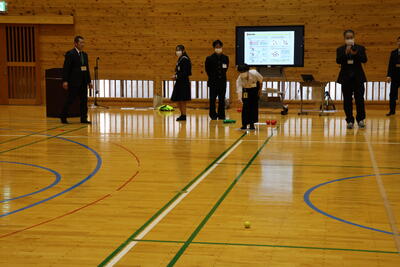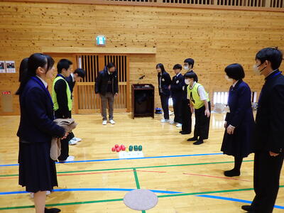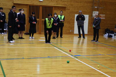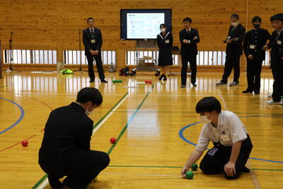 生徒と職員は、8チームに分かれて、班ごとに自己紹介を行いました。そして、一斉に「ボッチャ」の競技が始まりました。最初は、緊張したグループでしたが、一投ごとに笑顔や歓声があがり一気に和やかな雰囲気となりました。