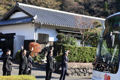 午前中授業のあと、100周年記念で人吉高校に寄贈されたバスに初乗車し、向かいました。