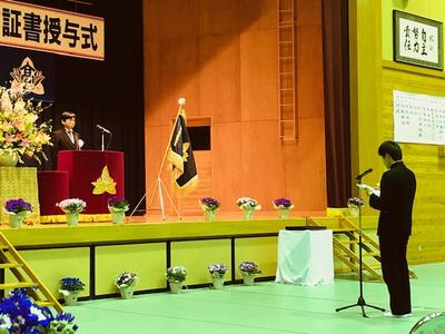 ただ今、卒業証書を授与した六名の皆さん、卒業おめでとうございます。保護者の皆様におかれましては、これまで励ましながら支えてこられ、本日の凛々しい我が子を前にして、お喜びも一入かと存じます。