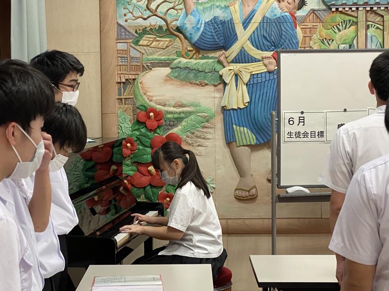 平江先生の素晴らしい指導光景です「仰げば尊し」の歌詞指導です中学校の音楽教室です3年生が「仰げば尊し」を歌います負けずに1・2年生も「蛍の光」を歌います