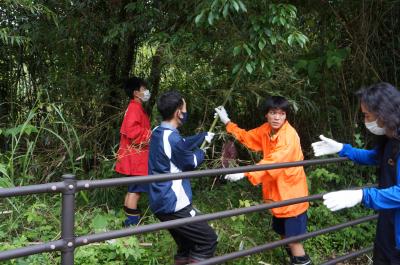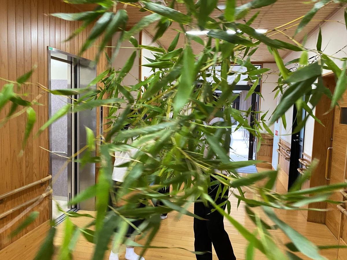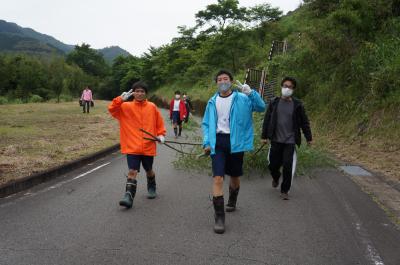 五木分校プロジェクトの時間に、農園の支柱にする竹を取ってきたついでに、校門そばから、生徒と先生が切ってきました。