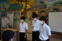 修学旅行では、大阪での班別自主行動が計画されています。どこに行くか選ぶため、1・2年生全員で、行ってみたいと思う候補地をそれぞれ選んで、お互いにプレゼンをしました。