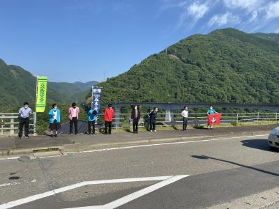 生徒・職員が立っている下に、校舎の屋根が見えています。奥に見えるのは川辺川にかかる頭地大橋。五木分校は五木村頭地地区、川辺川のほとりの大自然の中に位置しています。