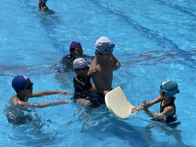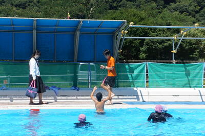 プール監視。髙田君、小学生に水をかけられて、すでにずぶ濡れです。