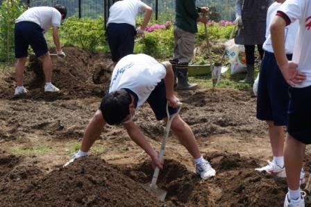 本校の「総合的な探求の時間」(1年)、「総合的な学習の時間」(2・3年)をそれぞれ「五木分校プロジェクト(五P)」、「TSプラン」と呼び、毎週木曜日6限目に設定してします。今日がその第1回目の授業で、担当の髙村先生からこの授業の意義や本日実施の圃場準備についてお話をいただきました。髙村先生の「畑に石灰をなぜまくのか?」、「なぜ畑を耕すのか?」、「三つ叉鍬の長所は?」等の質問に対し、さすが上級生はこれまでの体験をもとに見事に的確な回答を行っていました。興味関心が高まったところで草取りを行いながら鍬等で畑を耕し、これからの準備を行いました。今後この畑から、ゴーヤやキュウリ、スイカ、トマト、サツマイモができていく予定です。体験学習をとおして、多くのことを学んでいくことが期待されます。