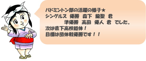 人吉球磨地区高校体育大会の各競技が4月26日に、各会場で実施されました。本校で唯一の運動部、バドミントン部は球磨中央高校で行われ出場しました。全校生徒の応援のなか、男子シングルスで2年生の高田優人君が見事優勝を果たしました。