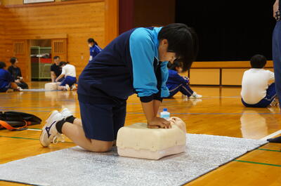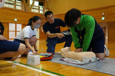 人吉球磨消防組合中央消防署北分署より6名の方々に来校していただき、胸骨圧迫やAEDの使い方などをレクチャーしてもらいました。今年は人工呼吸の方法まで教えていただきました!!