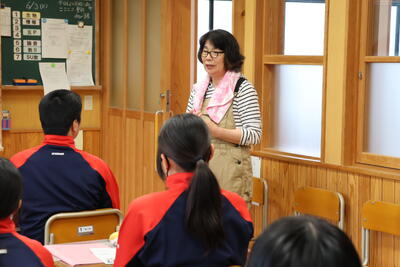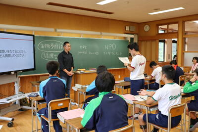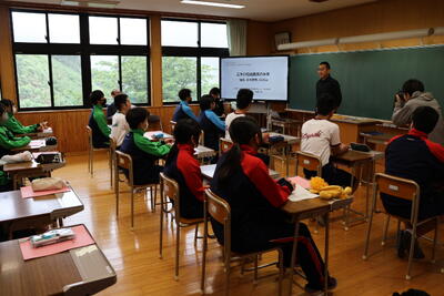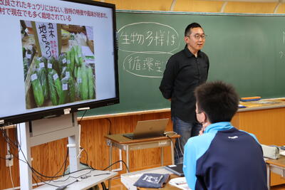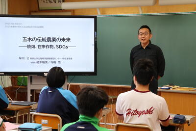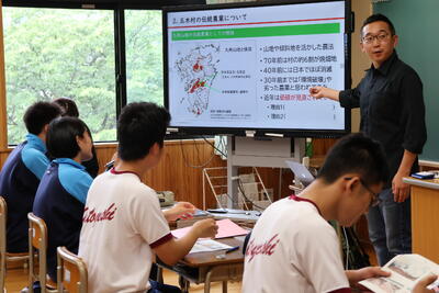 6月3日(火)には、東大先端研の社会包摂システム分野特任准教授 早川公先生と、作物栽培指導:樅木晴美先生、寺嶋悠先生にお越しいただき、1・2・3年生を対象に「五木の伝統農業の未来 ー 焼畑、在来作物、SDGs ー」について講話を頂きました。講話では、「研究は問をたてることから始まる。」と、質問を考えながら、受講しました。