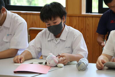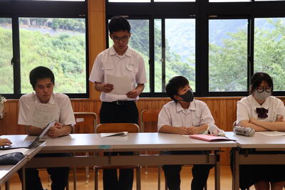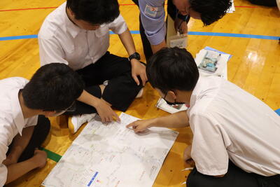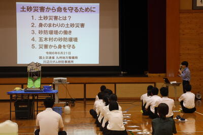 講師として、国土交通省「川辺川ダム砂防事務所」より11名の方々に来校していただき、今の日本の災害の状況や、五木村の砂防堰堤について御講話いだきました。また、ハザードマップを使い、自宅から避難所までの移動ルートについてグループごとに確認することが出来ました。