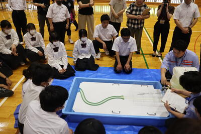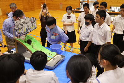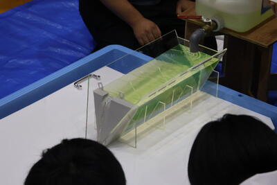 模型を使った実験では、土石流模型実験装置を使い、砂防堰堤で土石流や川の氾濫を防ぐ仕組や、流水型のダムの模型を使いダムの役割を分かりやすく学びました。生徒も前のめりになって洪水やダムのメカニズムを学ぶことができました。