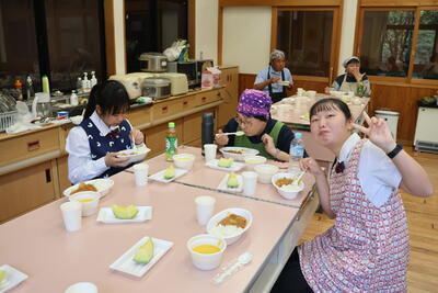 その後家庭科室へ行き、早速調理です!!今年のメニューは、「カレー」「かぼちゃスープ」「くねぶヨーグルト」です。引き続きALTのTahlia先生にも来ていただき、全校生徒・全職員で調理開始です!!
