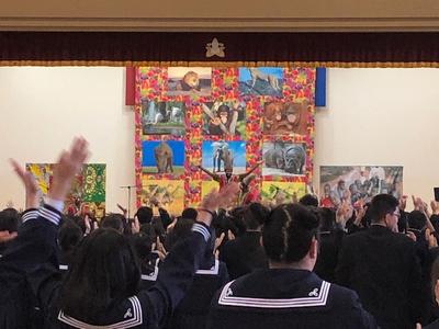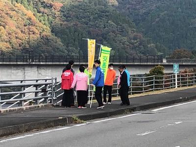 今週(11月5日~8日)は、あいさつ運動週間です。文化祭において人前で発表することに自信を持った生徒たちが、少しずつ大きな声であいさつができるようになっています。朝7時45分から8時まで行っています。見事に色付いた山の斜面を背景に、あいさつ運動が繰り広げられています。