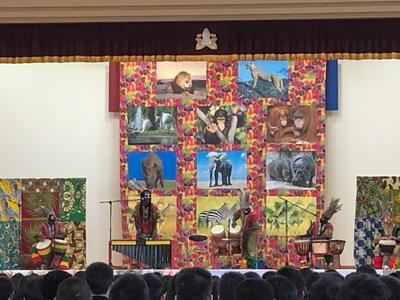 11月7日午後から、人吉高校体育館で全日制、定時制、五木分校合同での芸術鑑賞会が行われました。「アフリカンミュージックJOYコンサート」のタイトルで、たいへん楽しい1時間半を過ごしました。途中一緒に太鼓を叩いたり、叫んだり、踊ったりと生徒はもちろんのこと、先生方もノリノリの芸術鑑賞会となりました。
