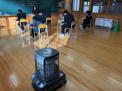 12月2日(月)より4日(水)まで期末考査期間となっております。落雷のため暖房器も全て故障し、復旧の目処がたっておりません。そこで、同じ敷地内にある五木中学校様より温かいご厚意で暖かいストーブをお貸しいただきました。五木村の冬は寒く、なんとかこのピンチをしのいでいこうと、周囲からのご協力をいただいておりますが、今週はずっと最低気温、氷点下の予報が出ております。五木分校では、午前9時過ぎに日が昇り、午後4時前には日が暮れます。さすがに気合いだけでは乗り越えられない状況です。