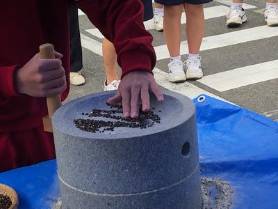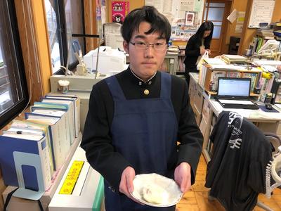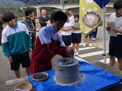 12月5日(木)午前10時から午後2時jまで、分校近くの道の駅「子守唄の里五木」において、今秋収穫された新そばを使って、村特有の太めんの「玄そば」が振る舞われました。分校生も総合学習、探究学習の一環として、五木村農林水産物協議会様より説明を行っていただいた後、温かいおそばをいただいきました。村の農産、食文化としてのそばを「玄そば」という石臼を引いて作られたそばは、独特の歯ごたえと香りが広がり最高に美味しかったです。ごちそうさまでした。
