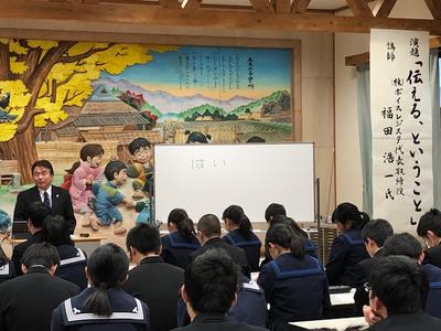 12月16日(月)5・6限目、国語科授業の一環として「コミュニケーション講座」を実施しました。元TKUアナウンサー福田浩一先生を講師にお招きし、「伝える、ということ」をテーマにご講演いただきました。CMの声を実際に生徒へご指導いただくなど、キャリア教育の視点も併せての内容に、あっという間の二時間でした。講演をとおして生徒たちの職業観も広げていただき、今後のテレビを観る視点が変わったという感想が聞かれました。福田先生、遠いところありがとうございました。