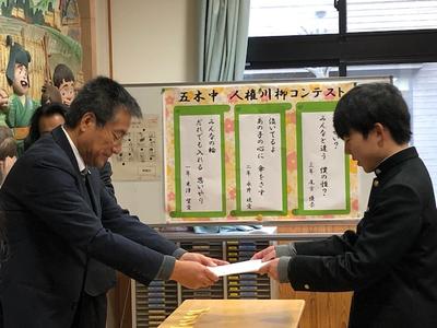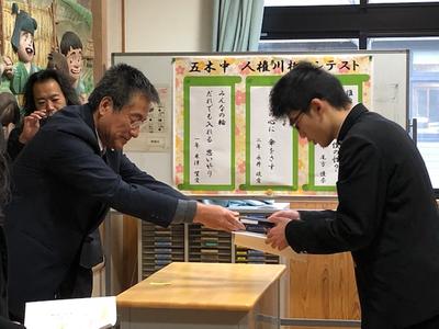 五木村主催「人権標語」の表彰 櫻井君、里田君、岩本君