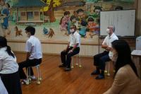 この日は、県の特別支援教育課から松岡指導主事、県立教育センターから堀川室長と星子指導主事、本校から平江副校長先生にもおいでいただいて、「学びのUD」の研究です。