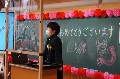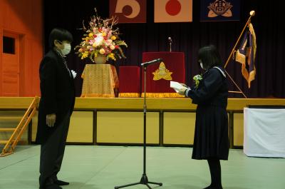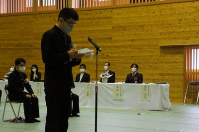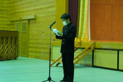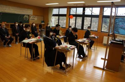 ただ今、卒業証書を授与した六名の皆さん、卒業おめでとうございます。保護者の皆様におかれましては、これまで励ましながら支えてこられ、本日の凛々しい我が子を前にして、お喜びも一入かと存じます。
