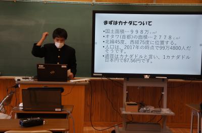 カナダ、トルコ、フィリピン…と調べ、内容を地理との学習と関連づけ発表してくれました。まとめる時間が少なかったようですが、ユーモアあふれる内容でとても盛り上がりました。