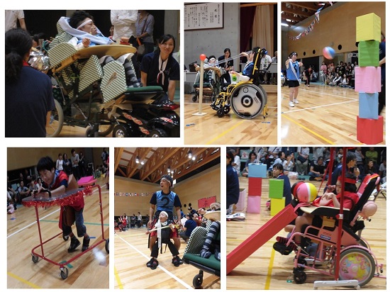 リレー形式で、たすきをつなぎながらゴールを目指しました。ウォーカーやキャスターボードで自分の脚力を生かして進んだり、手でボールを転がして的に当てながら進んだりと、生徒一人一人の日頃の学習で取り組んでいることを発揮しながら、たすきをつなぐことができました。大接戦の末、白団が先にゴールテープを切り、勝利を収めました。