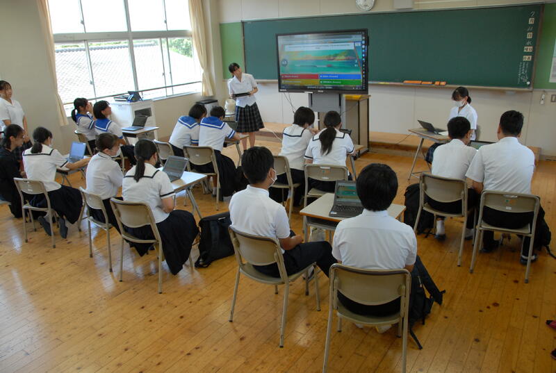 毎週火曜日は、本校が独自で設定している科目「異文化コミュニケーション」が行われます。この科目では問題集を使うこともありますが、天草のものや日本のもの、また外国のものについて調べてプレゼンテーションを行ったり、ディスカッションを行ったりなどアウトプット活動にかなり重点的に行われています。
