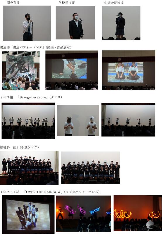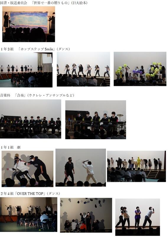 体育館では、各クラス(ステージ)・図書放送委員会・福祉科・音楽科・書道部・有志などによる発表がステージで繰り広げられました。