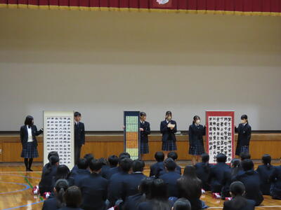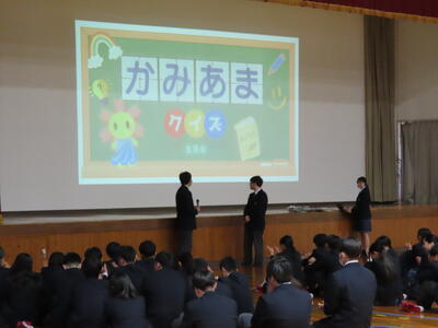 続いて、生徒会主催の「かみあまクイズ」が実施されました。上天草高校にまつわる問題が次々と出題されましたが、1年生の正答率の高さには司会の生徒も驚くほど。クイズを通じて緊張もほぐれ、会場は終始和やかな雰囲気に包まれました。