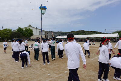 プログラム前半の「入場行進、開会式、演舞、玉運び競争、巧緻競争、綱引き、ムカデ競争」の写真です。