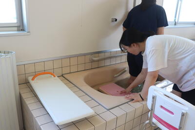 今回は座学で学習したことをもとに、実際にお湯をはり入浴補助用具を使い実習しました。