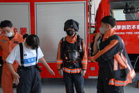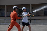 ①「天草消防」の皆様にお世話になっている3名は、本校内の消防設備点検に訪れていました。色々な場所で、防災に関する様々な点検項目があるようです。午後は着装訓練及び放水体験。実際に消火に必要な装備を着てみたり、ホースで放水体験を行いました。生徒3名は、着装するのに数分かかったようですが、消防士の方は約10秒ほどで身につけるとのことです。日頃の訓練をしっかり積み上げることがいかに大切かを学びました。