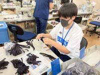 ②次は製造業の「ワコール」様、「上天草商工会」様、「上天草市立中央図書館」様でお世話になっている生徒たちです。写真1枚目(左)は、女性向け下着を製造しているワコール様での研修の様子です。こちらの工場では、素材にこだわった一つ一つの製品をすべて手作業で作り上げます。広い室内にたくさんのミシンが並んでいる様子は圧巻です。生徒はその作業の一部を一生懸命取り組んでいました。