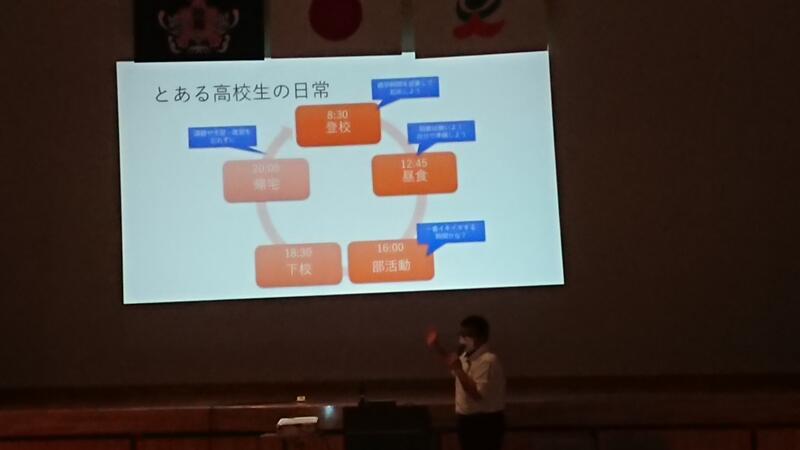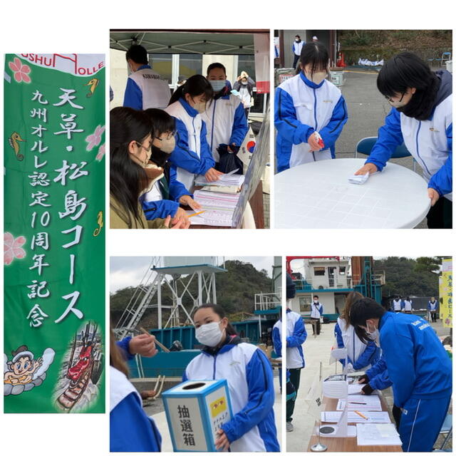 こちらでは、学校パンフレットを使った「学校紹介クイズ」とグローカル文理コースの授業である「異文化コミュニケーション」の学びの成果発表会(上天草クイズ)が行なわれました。