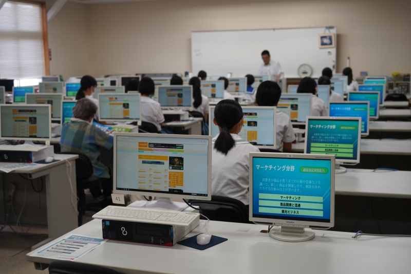 こちらでは、商業教育の魅力をプレゼンしました。また、ビジネスシーンで必須のスキル「タイピング能力」を鍛える「タイピングソフト」を体験してみました。