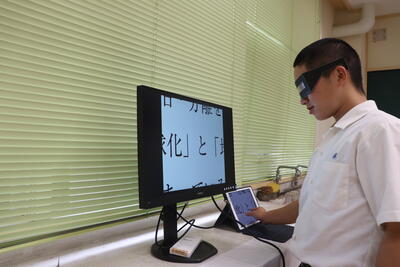 盲学校にお伺いし、視覚特性や学習上のニーズ等に基づいて開発している教科書や教材を閲覧するためのUDブラウザを実際に見学させていただきました。