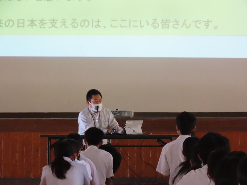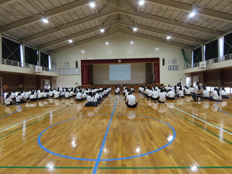 講師はゆあさいどくまもとの波口先生、上塚先生。穏やかな語り口に、全校生徒、職員、熱心に耳を傾けました。
