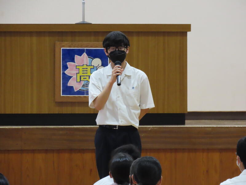 役員を代表して、生徒会長が感謝状を受け取り、全校生徒に向けて挨拶しました。