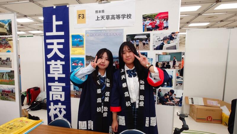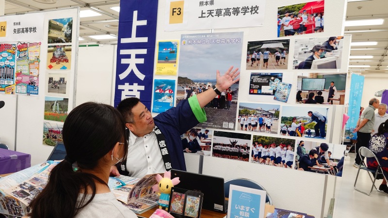 会場には北海道から九州までの87校がブースを設け、地域みらい留学を希望・関心のある中学生とその保護者に、各学校での学びや生活環境について説明をしました。また当日は、上天草高校生の生の声を届けたく、2名の上天草高校生が参加しました。