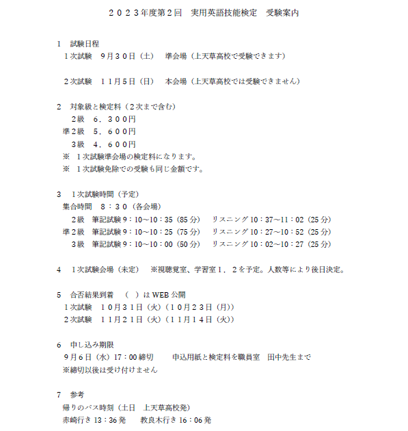 校内申し込み期間は8月17日(木)〜9月6日(水)です。申込用紙と受験料(※画像ファイルを参照)を、職員室・田中先生まで持参してください。