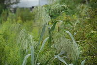 セイタカアワダチソウ(キク科) 第二次世界大戦後に温暖地を中心に帰化した北米原産の帰化植物。一時期大繁殖し、ススキの生育地が激減した。ミツバチの蜜源として利用されることもある。 |