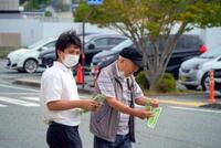 また、クイズのポイントにもなっている 道の駅上天草さんぱーるでもチラシ配りを実施。観光客の方々にも積極的にご案内を差し上げてました。